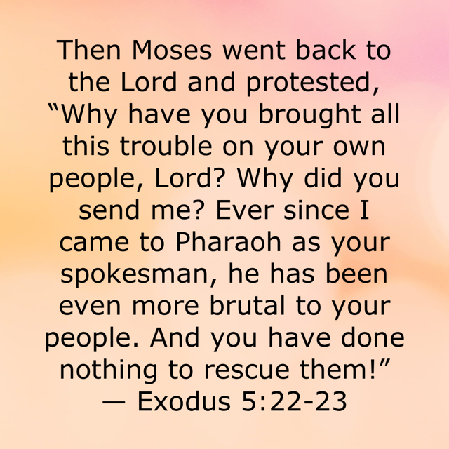 Moses and Aaron went to Pharaoh and said, “Let us go and worship the Lord God.” Pharaoh responded, “Who is the Lord and why should I listen to Him? I don’t know Him and I won’t obey Him.” He then initiated programs to flex his power and oppress the children of God. Can you imagine the conflict going on inside Moses and Aaron? This was not what they had envisioned.