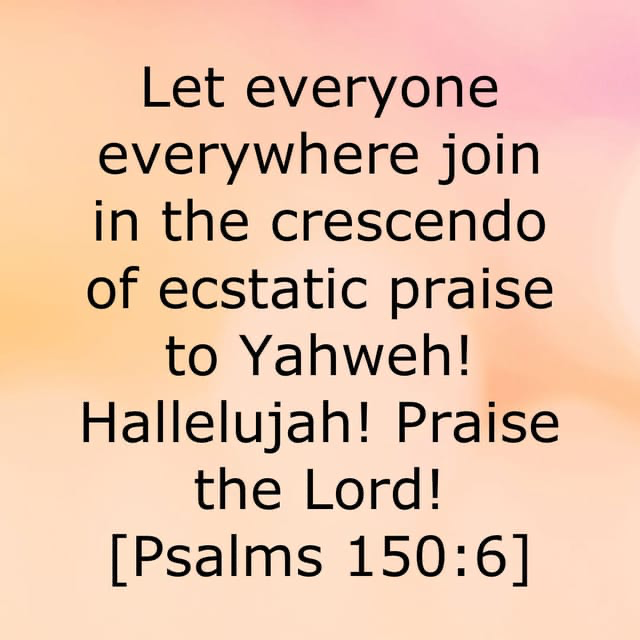 “Hallelujah! Praise the Lord! Praise God in his holy sanctuary! Praise him in his stronghold in the sky! Praise him for his mighty miracles! Praise him for his magnificent greatness! Praise him with trumpets blasting! Praise him with piano and guitar! Praise him with drums and dancing! Praise him with loud clashing of cymbals! Praise him upon the high-sounding cymbals! Let everyone everywhere join in the crescendo of ecstatic praise to Yahweh! Hallelujah! Praise the Lord!”