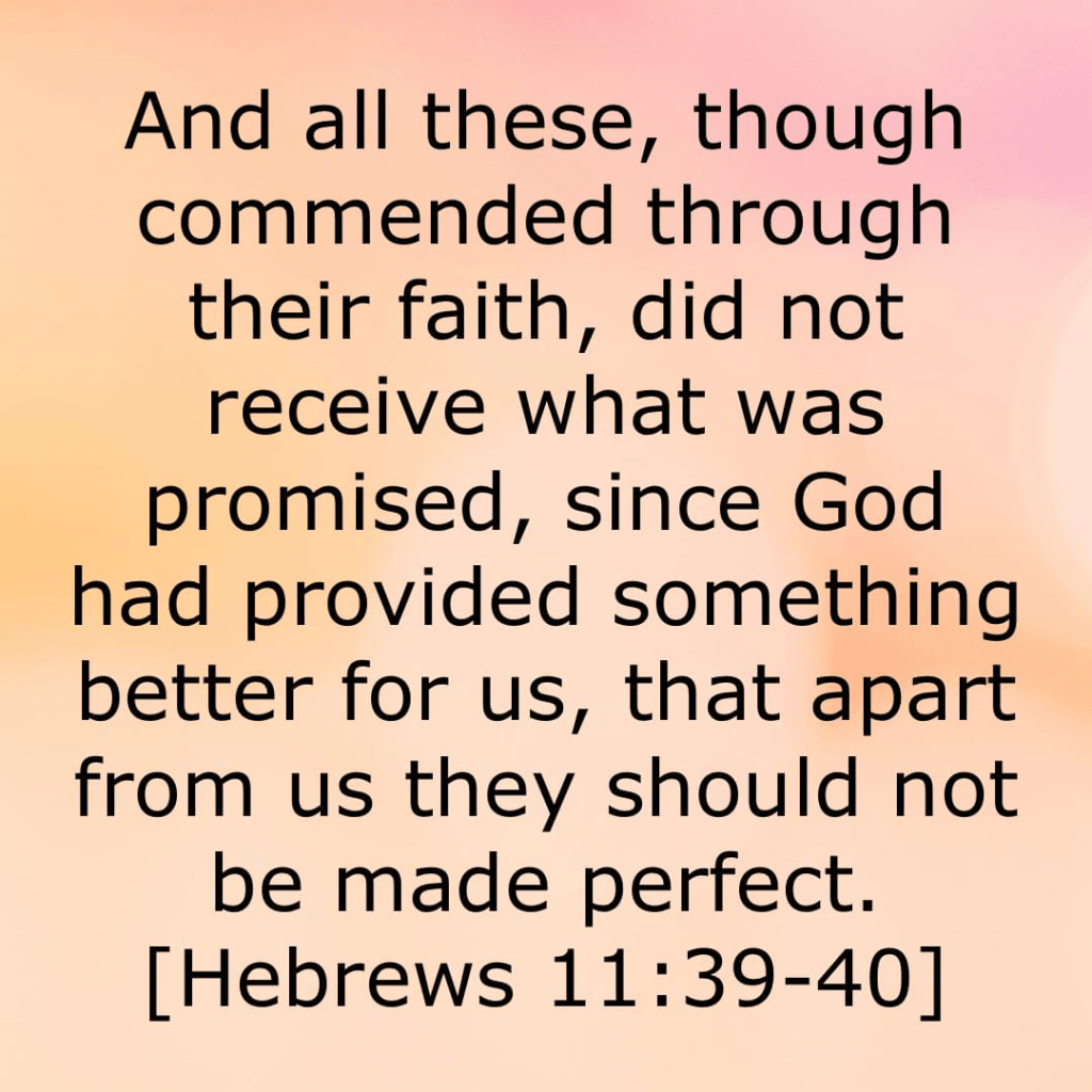 Hebrews 12:1-2a says, ““Therefore, since we are surrounded by so great a cloud of witnesses, let us also lay aside every weight, and sin which clings so closely, and let us run with endurance the race that is set before us, looking to Jesus, the founder and perfecter of our faith.” Every person of faith plays their part in looking to and pursuing Jesus, and then they pass the baton and join the cloud of heavenly watchers who cheer for those running the next leg of the race towards completion of the Kingdom plan. Through faith we become part of a cross-generational team continually advancing together. When we come to the culmination (the perfection and completion of God’s promise), we will actually all be resurrected and brought together, and as one we will step across the finish line. Together we will be perfected.