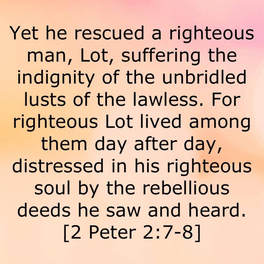 At first Lot lived outside Sodom, but when enemy kings attacked the city they also took him and everything he owned. Abram came to his rescue, but after that experience, Lot moved his family into the “safety” of the city. This proved to be another serious error because the wickedness of the culture infected his household. In Sodom, Lot lost everything he owned and everything he cared about (including his wife). He escaped to a cave in the mountains with only his two daughters, who brought the wickedness of Sodom with them. The family line of Lot (his legacy) was corrupted and became enemies of the line of Abram. Yet through all of this and all of Lot’s bad choices, he was righteous and he was greatly distressed by the culture into which he had brought his family. Sadly, even in his righteous distress, Lot didn’t leave until God literally dragged him out.