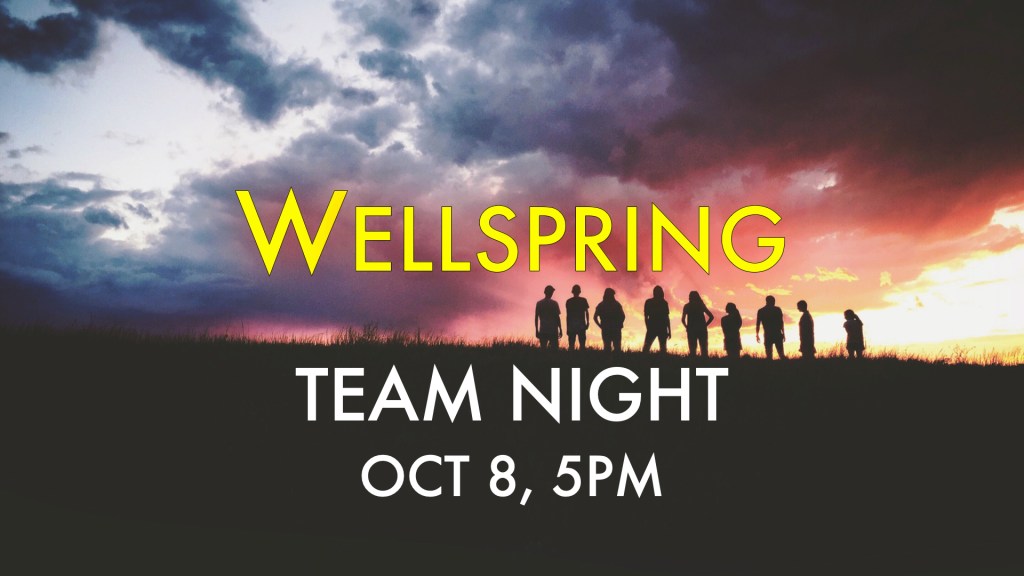 Saturday, October 8th, we’re going to break into teams to talk about the different “chores” that have to take place for Wellspring Live. If every person will take a pebble, we can move a mountain. Not that anything we have to do is as cumbersome as a mountain, but I’m sure you get my point. We will break into five basic areas of responsibility: the children’s ministry team, the hospitality and welcome team, the multimedia team, the cleaning team, and the security team. It’s important for each team to be able to sit down together and go through details. Once the teams have had time to meet, we’ll gather back together for communion and worship.