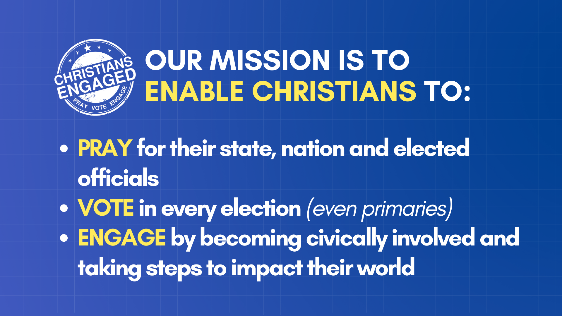 Use the QR code provided below to take the pledge to Pray, Vote, and Engage.