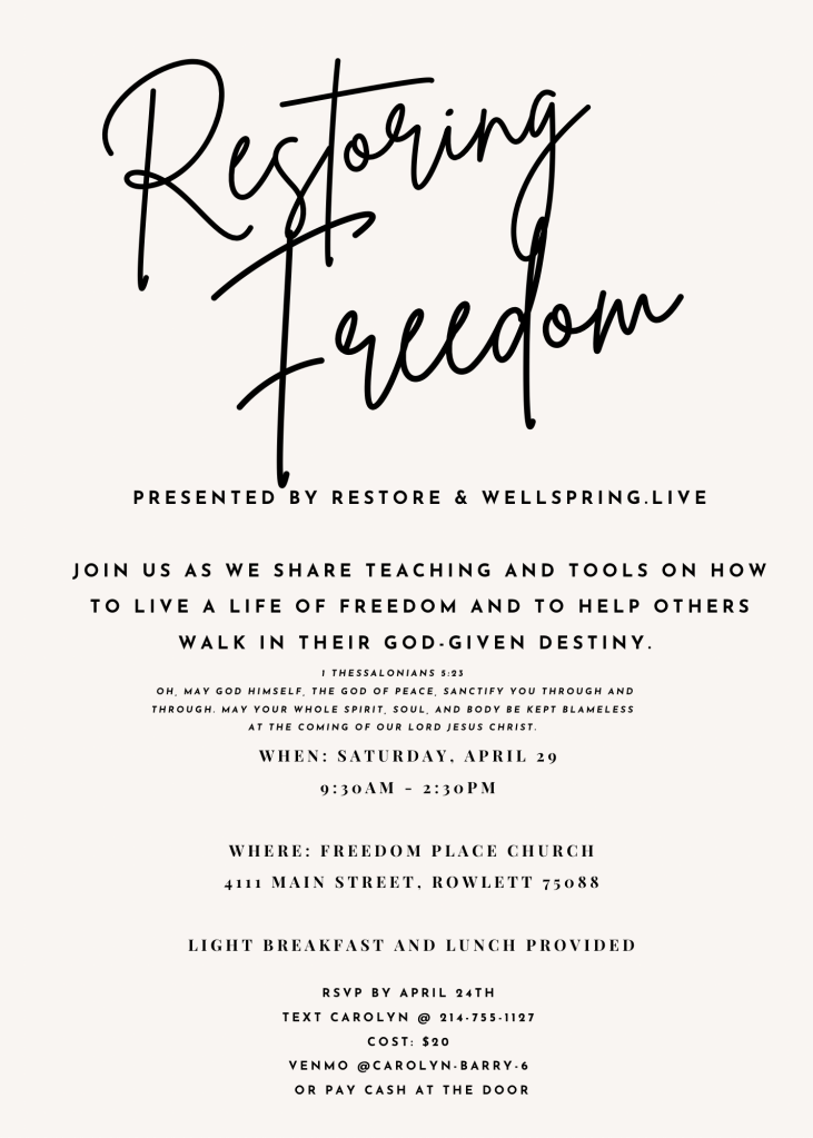 - Apr 29, Sat 9:30am-2:30pm – Restoring Freedom
